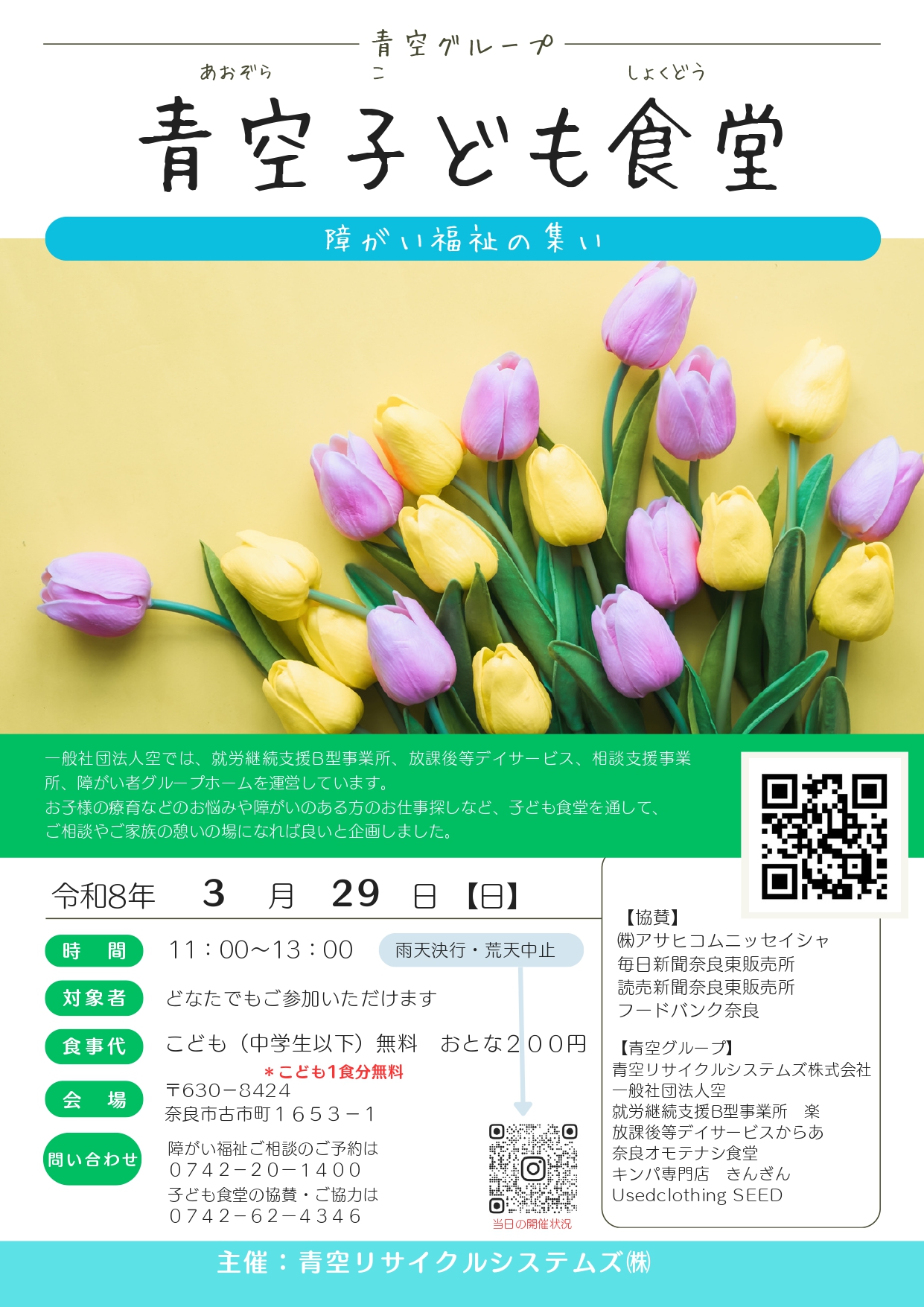 次回のあおぞらこども食堂は3月29日(日)に開催いたします。 こどもさんはもちろんどなたでもご参加いただけます。 ぜひお越しください。